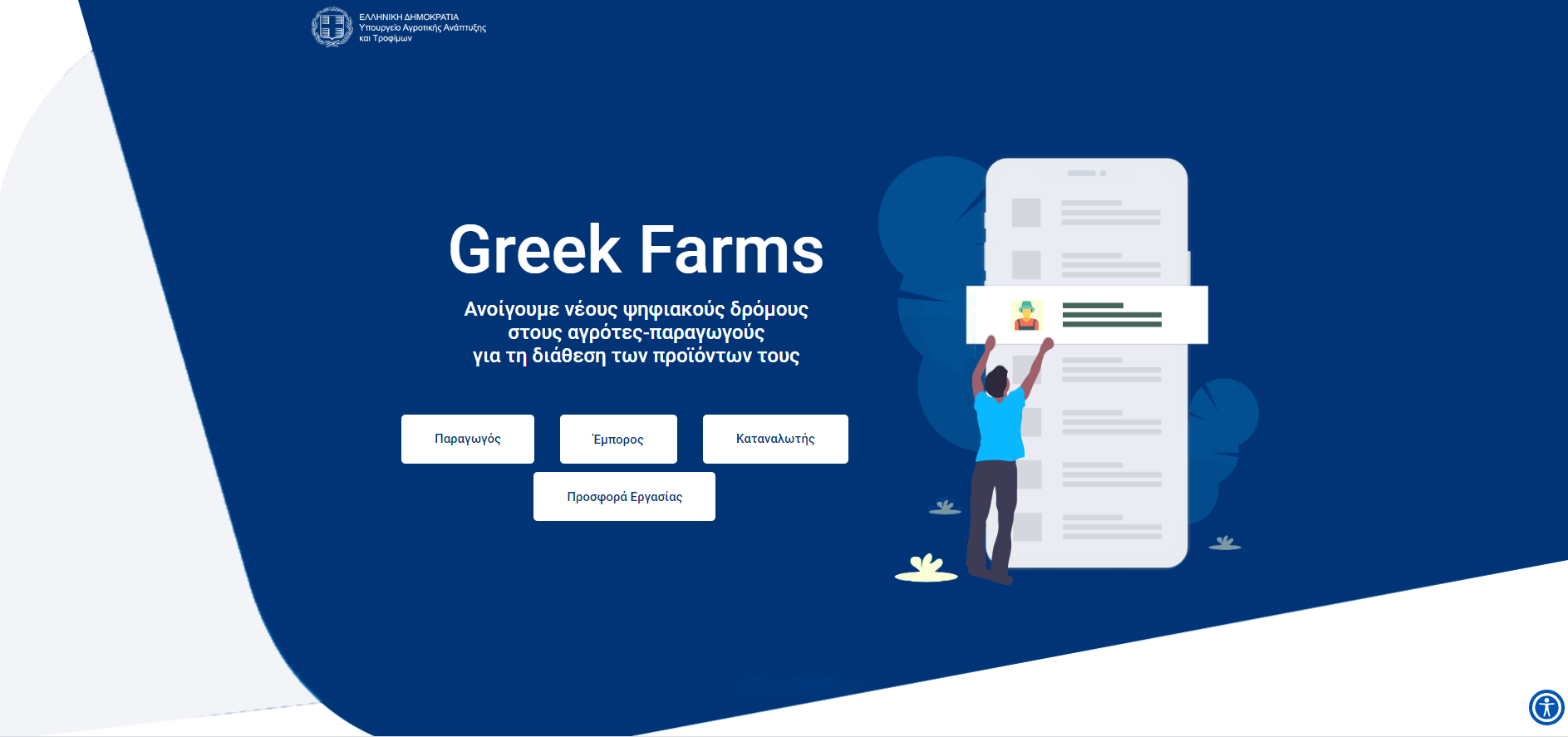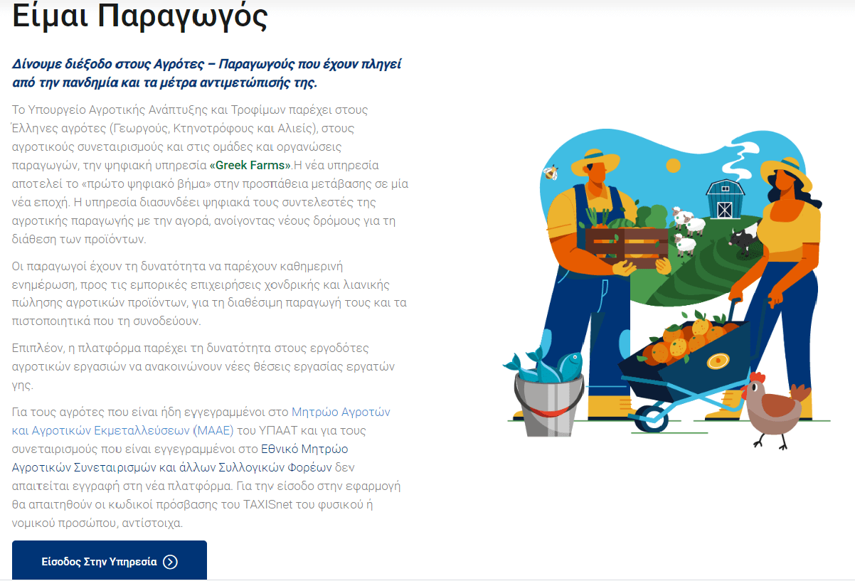 Από το σημείο αυτό μπορείτε να πραγματοποιήσετε είσοδο με τον επιλεγμένο ρόλο στην κεντρική σελίδα της ψηφιακής υπηρεσία «Greek Farms». Επιλέξτε «Είσοδος στην Υπηρεσία» για να συνδεθείτε.